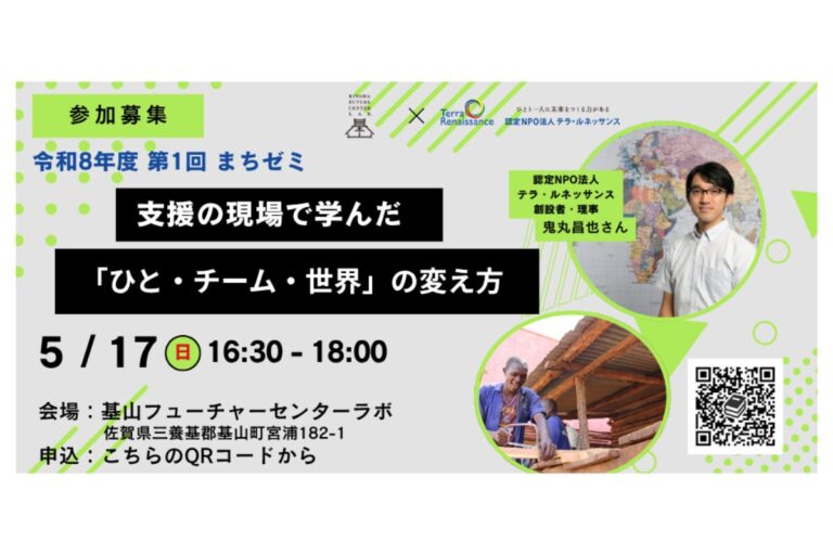【令和8年度1回目の「まちゼミ」のご案内】 満を持しての登場です! 基山町にある東明館中学校・高等学校内に佐賀事務所を構える認定NPO法人テラ・ルネッサンスの創設者:鬼丸昌也さんをお迎えして今年度第1回目の「まちゼミ」を […]